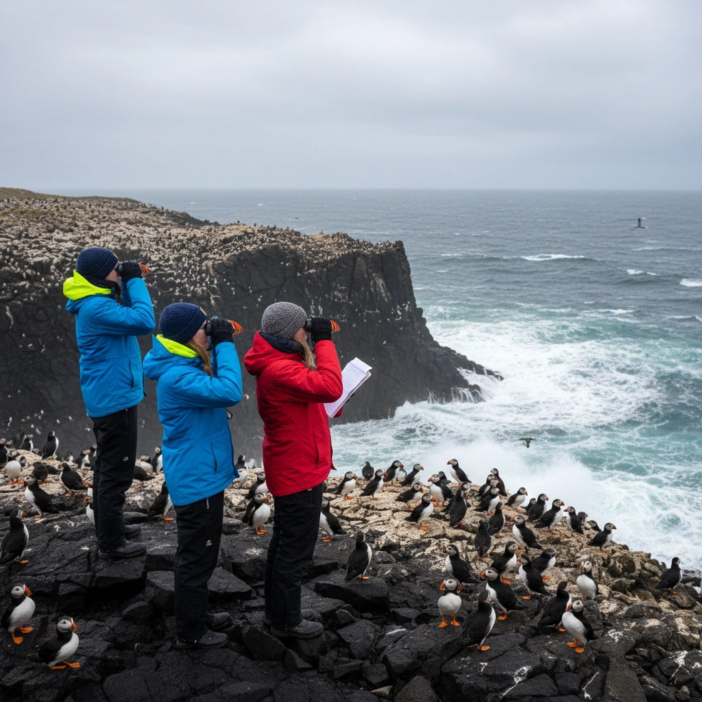 Implement systematic wildlife observation and ecosystem monitoring activities that contribute directly to conservation research efforts. Students in East Iceland participate in structured observations of puffin colonies and seal populations, documenting behavior patterns and population dynamics that support wildlife management decisions.