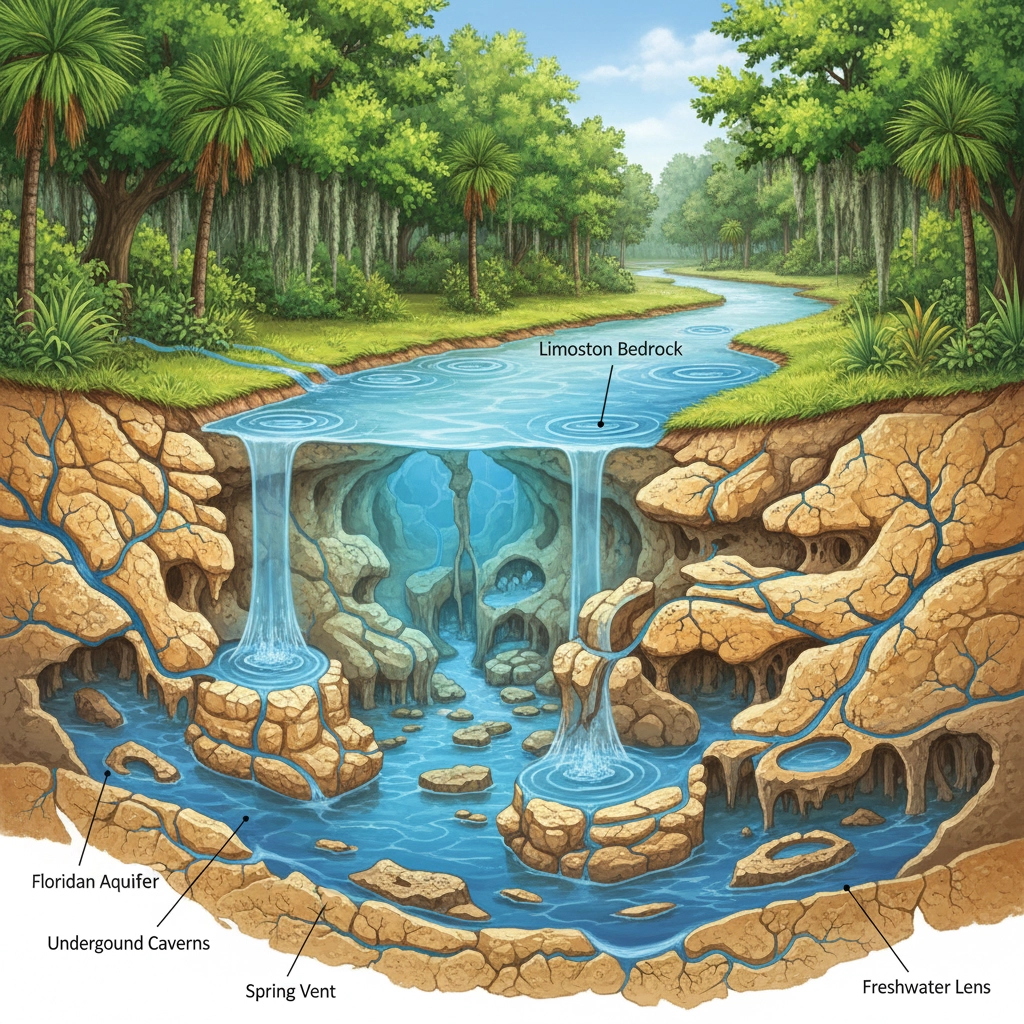 The foundation of Crystal River's ecosystem lies deep beneath the surface in the Floridan Aquifer, one of the most productive karst systems in North America. This massive underground water reservoir, formed by limestone bedrock over millions of years, demonstrates fundamental geological processes that students can observe through spring discharge patterns and water chemistry.