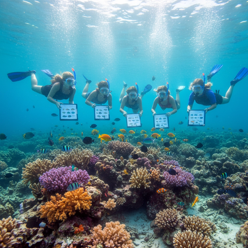 Snorkeling Research Expeditions: Conduct systematic reef surveys using standardized transect methods. Students record species observations, estimate coral coverage percentages, and document environmental conditions. Provide underwater writing materials and species identification guides to ensure accurate data collection.