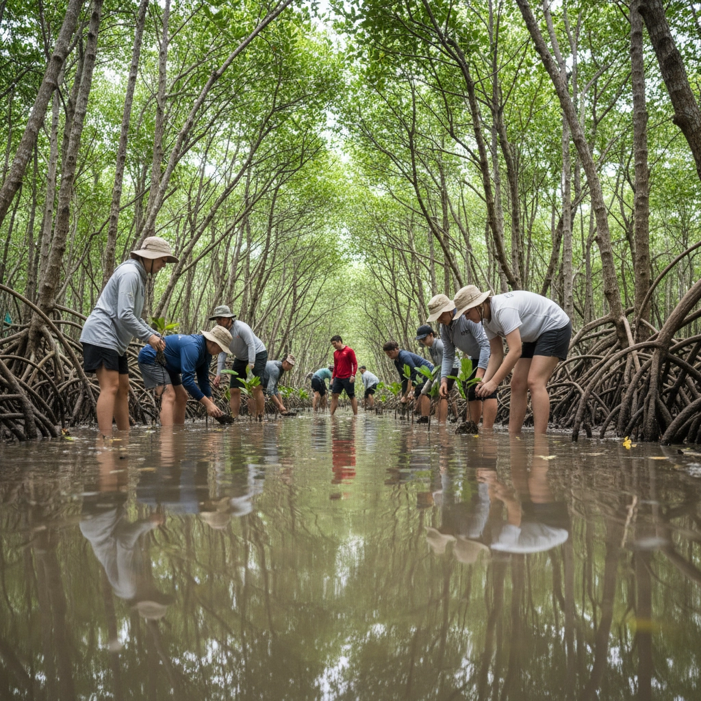 Mangrove Ecosystem Studies: Examine root system architecture, measure water quality parameters, and identify invertebrate species inhabiting mangrove environments. Students participate in restoration activities by planting mangrove saplings and monitoring existing restoration site progress.